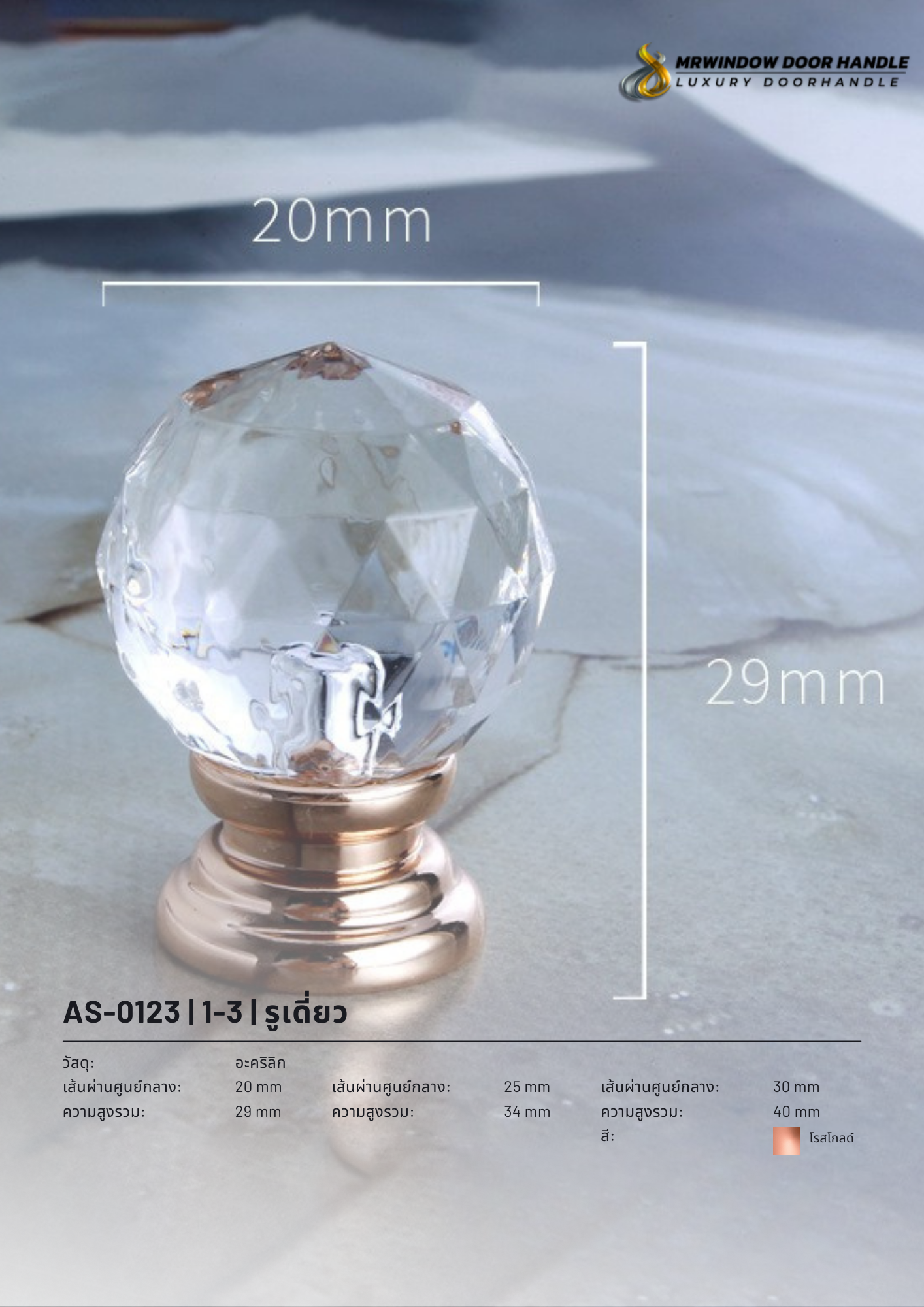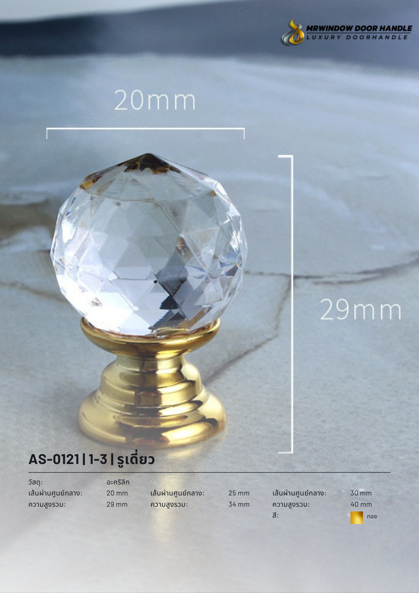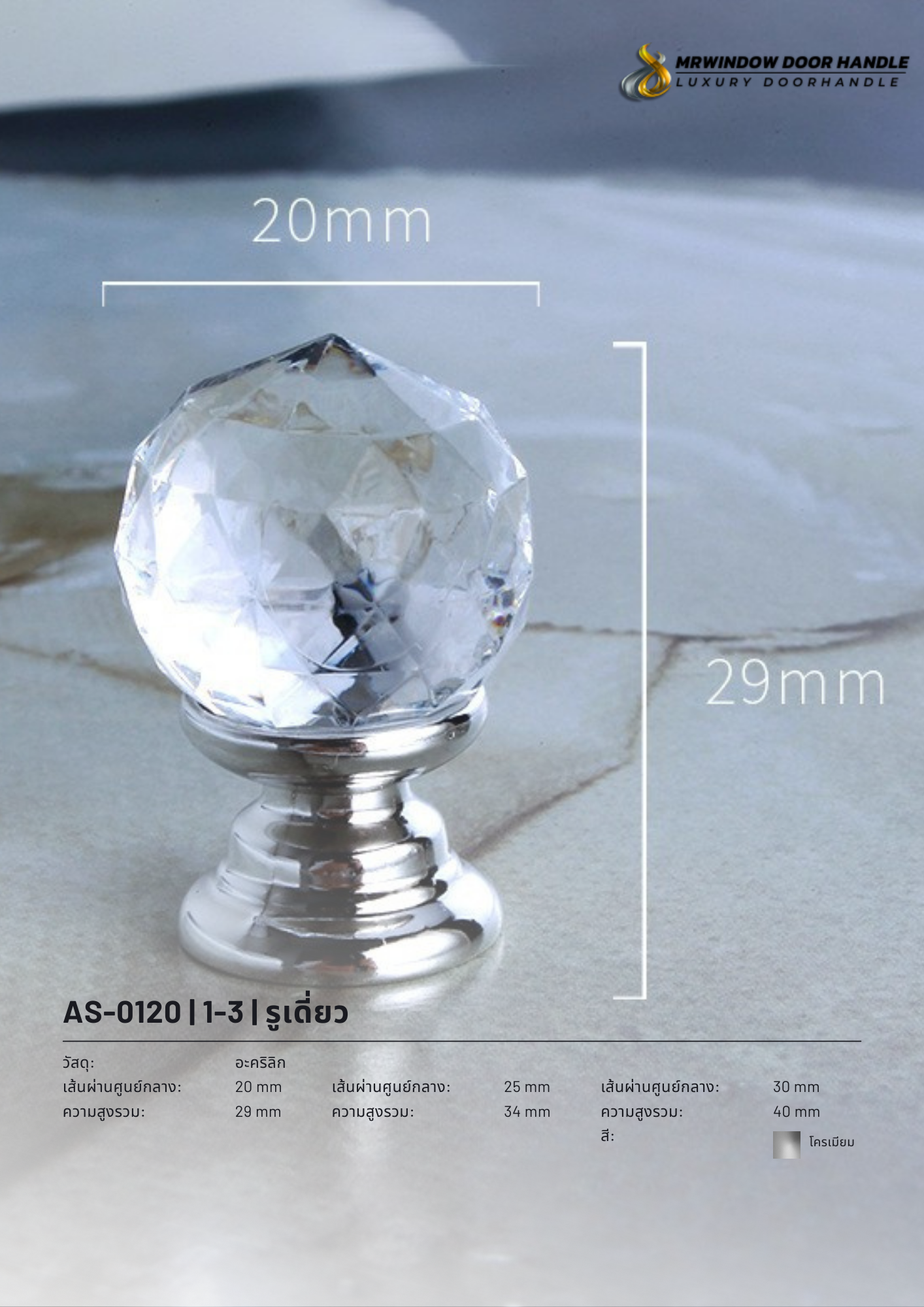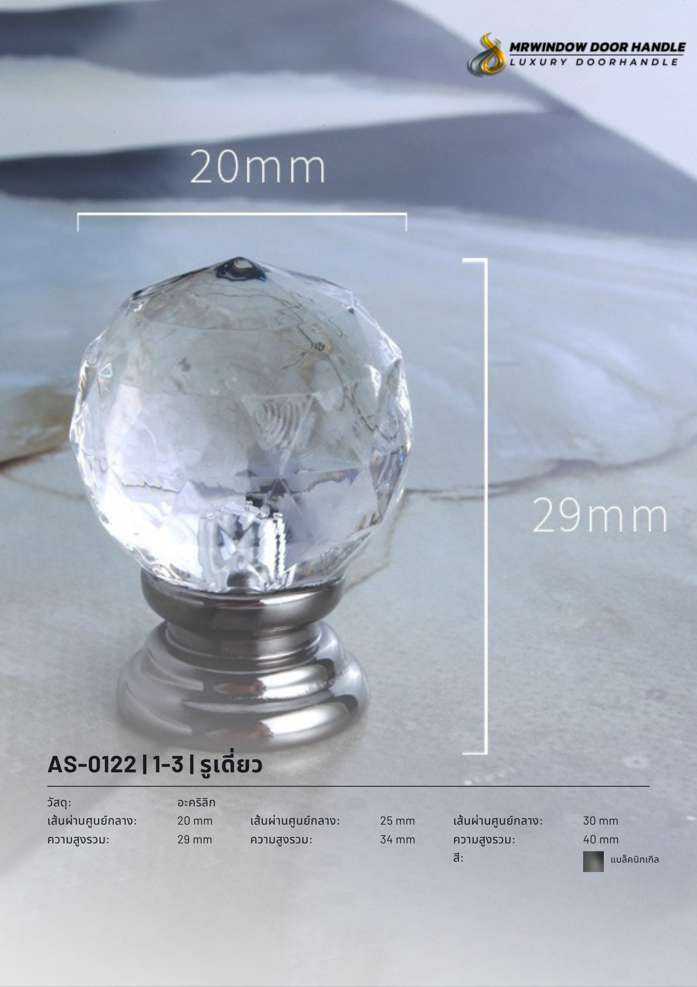 รุ่นนี้รวม 4 รหัสสินค้าไว้ในหน้าเดียว (AS-0120 / AS-0121 / AS-0122 / AS-0123) เพื่อให้ลูกค้าเลือกแบบ/สีที่ต้องการได้สะดวก พร้อมเลือกขนาดได้ 3 ขนาด (20/25/30 mm) โดยความสูงรวมจะเปลี่ยนตามขนาด (29/34/40 mm) ช่วยให้เลือกให้เหมาะกับสัดส่วนเฟอร์นิเจอร์ได้ง่าย