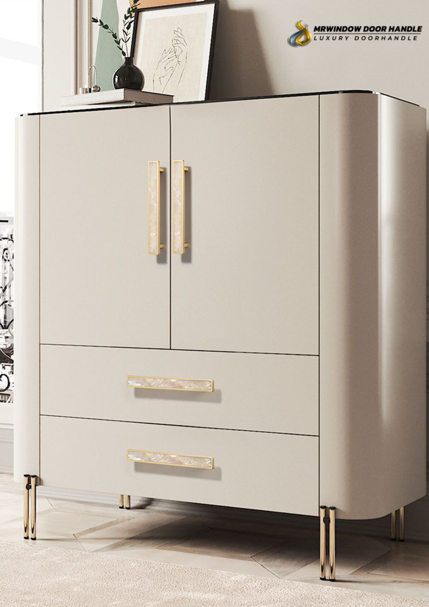 ไฮไลต์สำคัญของซีรีส์นี้คือวัสดุ เปลือกหอยธรรมชาติ ที่ให้ประกายมุกและมิติของสีแบบ “เปลี่ยนเฉดตามแสง” ทำให้เฟอร์นิเจอร์ดูมีชีวิตและดูแพงขึ้นทันที โดยเฉพาะเมื่อจับคู่กับกรอบ ทองเหลือง ที่ช่วยเพิ่มความหรูหราและความคมชัดของเส้นงาน ฮาร์ดแวร์ชุดนี้เหมาะมากกับหน้าบานสีอ่อน (ครีม/ขาว/เทา) หรือไม้โทนอุ่น รวมถึงงาน Modern Contemporary ที่ต้องการดีเทลเด่นแบบไม่เยอะเกิน
