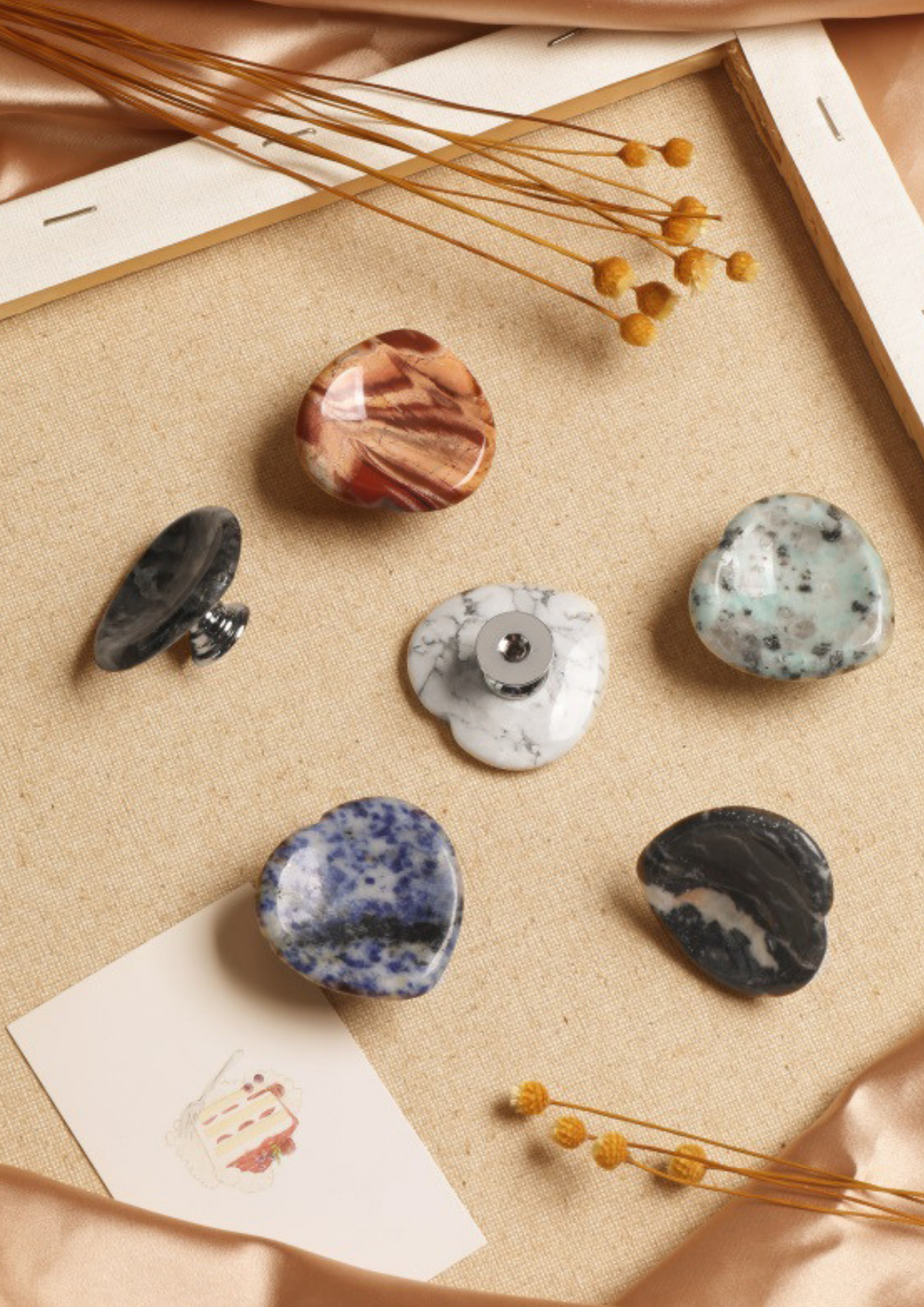 ตัวหัวจับทำจาก หินธรรมชาติ จับคู่กับฐาน โลหะชุบโครเมียม ให้ความเงางาม แข็งแรง และดูสะอาดตา เข้าได้ทั้งสไตล์ Modern, Luxury, Japandi และ Contemporary ขนาดกำลังพอดีมือ ใช้งานจริงสะดวก ช่วยเปลี่ยนฟีลของเฟอร์นิเจอร์ทั้งชิ้นให้ดูใหม่ขึ้นทันทีโดยไม่ต้องเปลี่ยนบาน