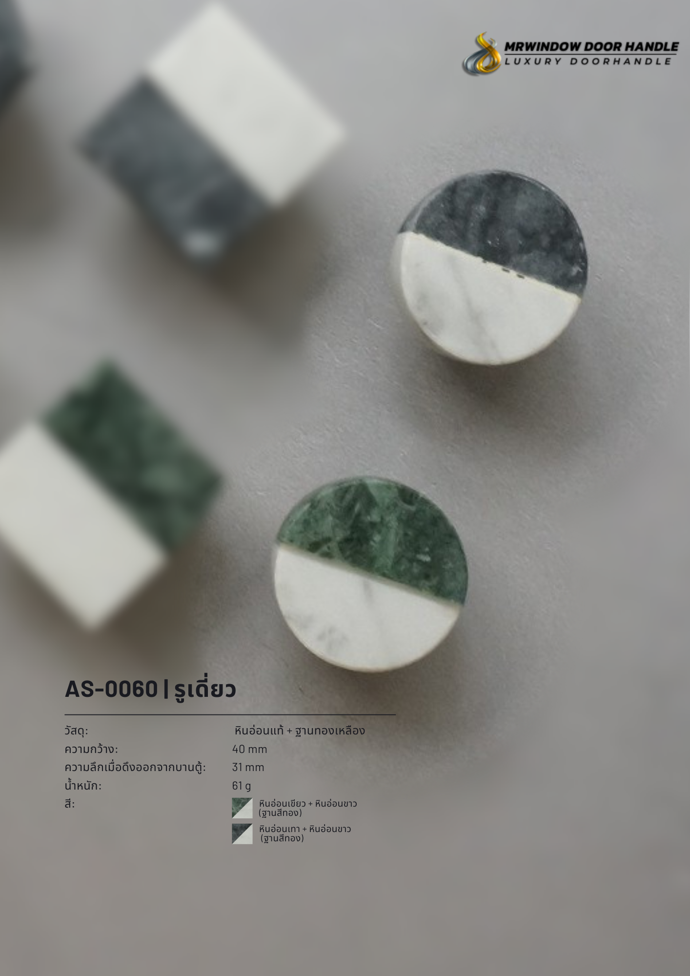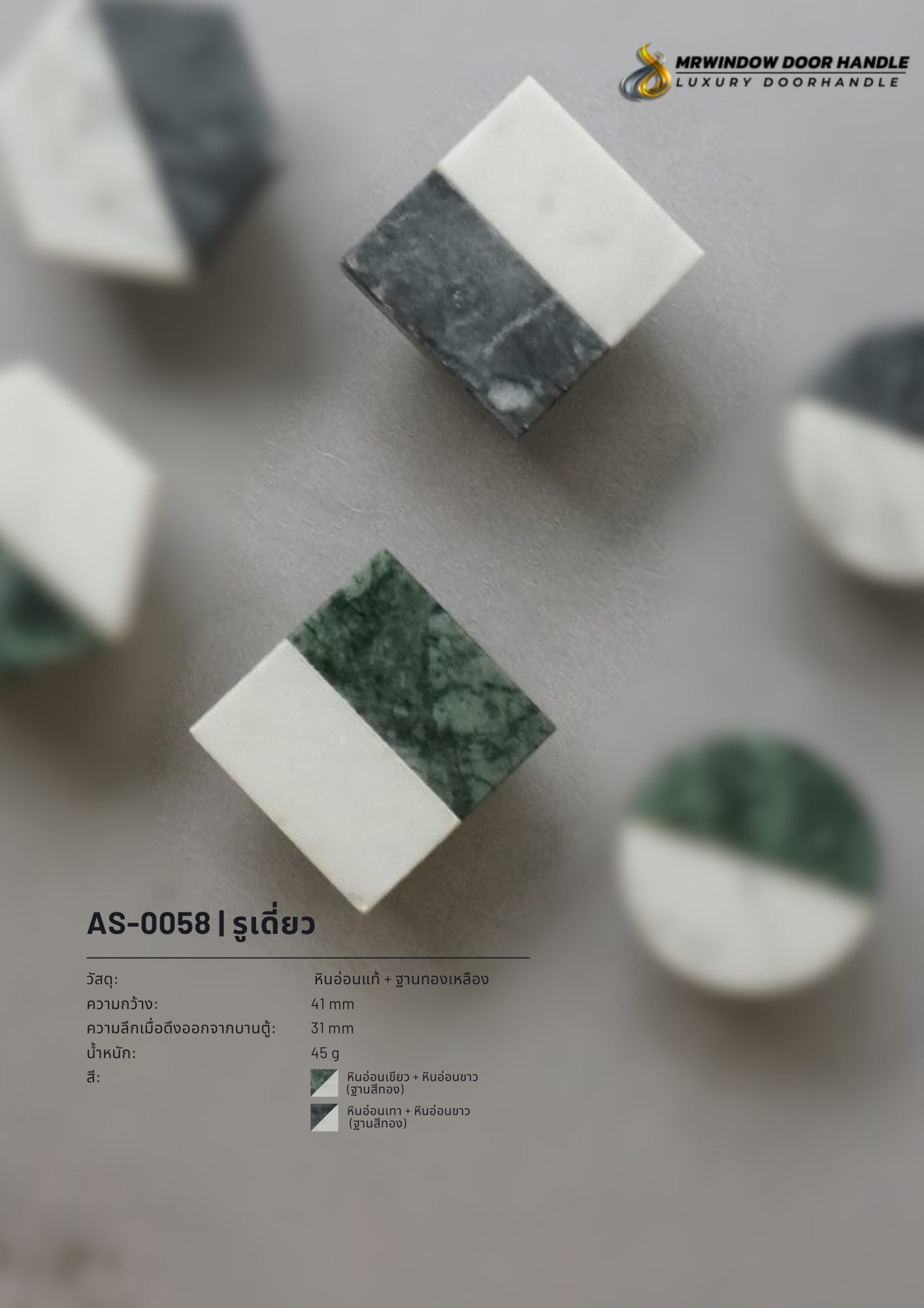 ปุ่มจับดีไซน์ทูโทน AS-0058 / AS-0059 / AS-0060 ออกแบบภายใต้แนวคิด “Luxury Minimal Stone Hardware” โดดเด่นด้วยการผสาน หินอ่อนแท้สองเฉดสี (Two-Tone Marble) ที่ให้ความรู้สึกหรูหรา เรียบง่าย และมีเอกลักษณ์เฉพาะตัวในทุกชิ้นงาน