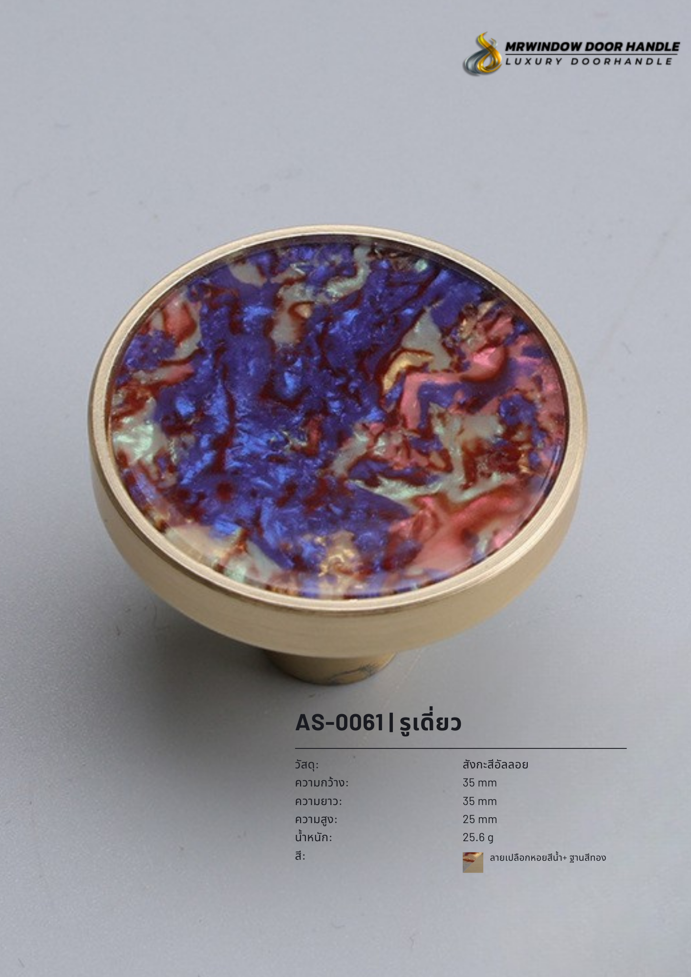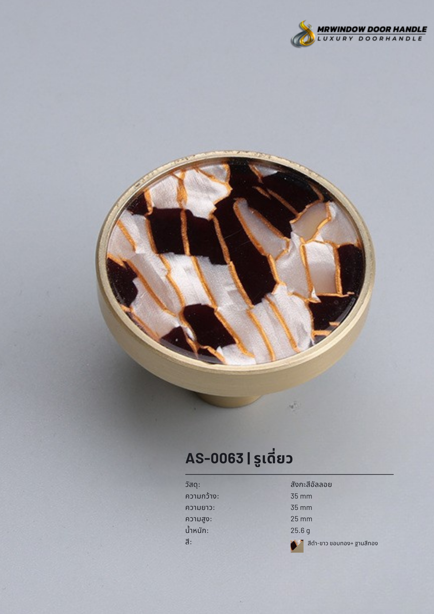 ปุ่มจับเฟอร์นิเจอร์ AS-0061 – AS-0066 ผลิตจากวัสดุหินเรซิ่นคุณภาพสูง ผสานกับฐานทองเหลืองแท้ ให้ความรู้สึกหรูหรา มีเอกลักษณ์เฉพาะตัวในทุกชิ้น ด้วยลวดลายและสีสันที่แตกต่างกันอย่างมีสไตล์ เหมาะสำหรับติดตั้งกับลิ้นชัก ตู้เสื้อผ้า ตู้ข้างเตียง และเฟอร์นิเจอร์บิวท์อินทุกประเภท ช่วยยกระดับงานตกแต่งภายในให้ดูพรีเมียม เรียบหรู และมีรายละเอียดที่โดดเด่นอย่างลงตัว