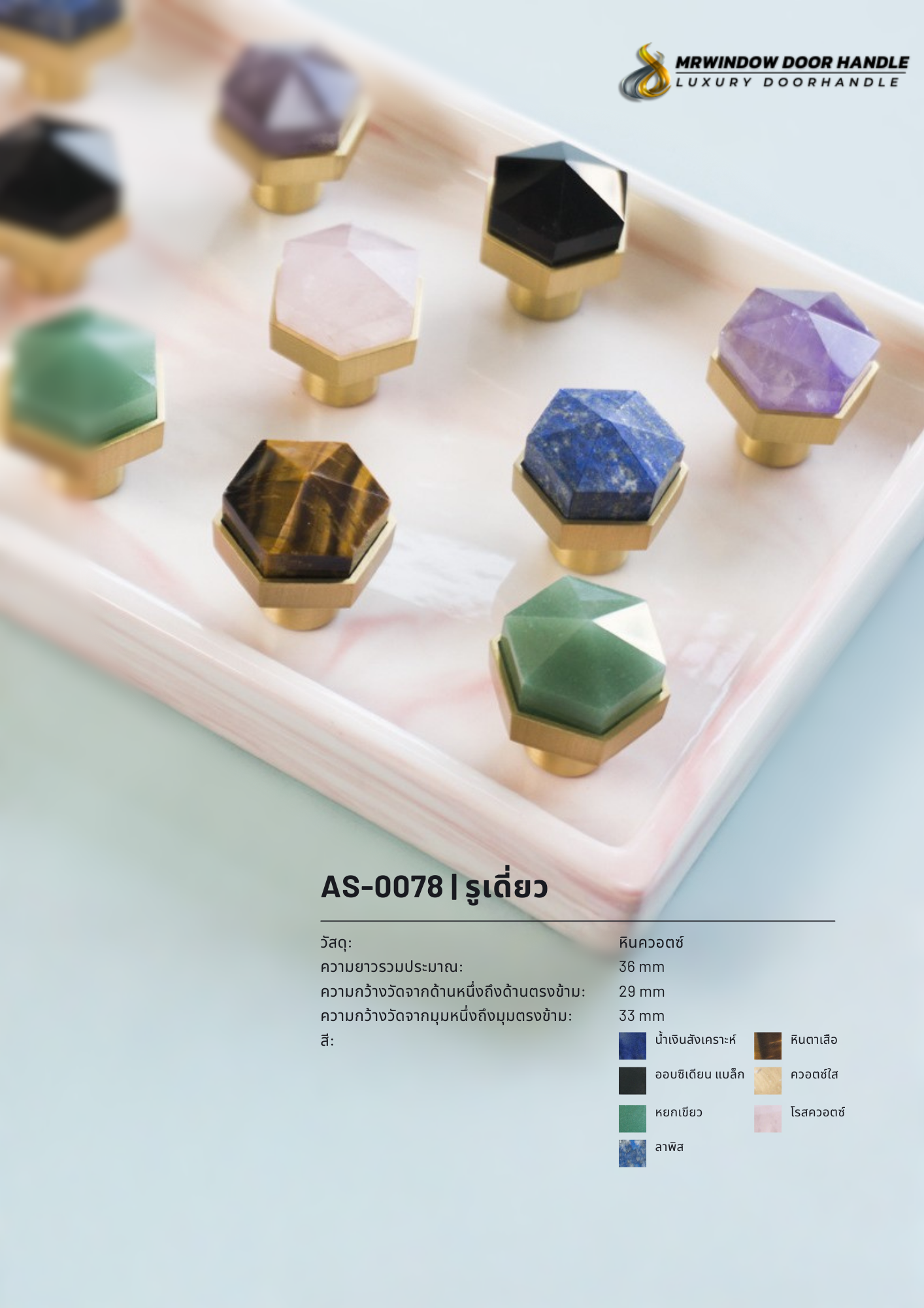 ตัวปุ่มผลิตจากหิน Quartz และ Crystal คุณภาพสูง ผ่านการเจียรผิวอย่างประณีต ให้สัมผัสเรียบหรู พร้อมฐานโลหะสีทองที่ช่วยเสริมความหรูหรา เหมาะกับการใช้งานทั้งในบ้าน คอนโด โรงแรม รีสอร์ท หรือโครงการตกแต่งระดับไฮเอนด์