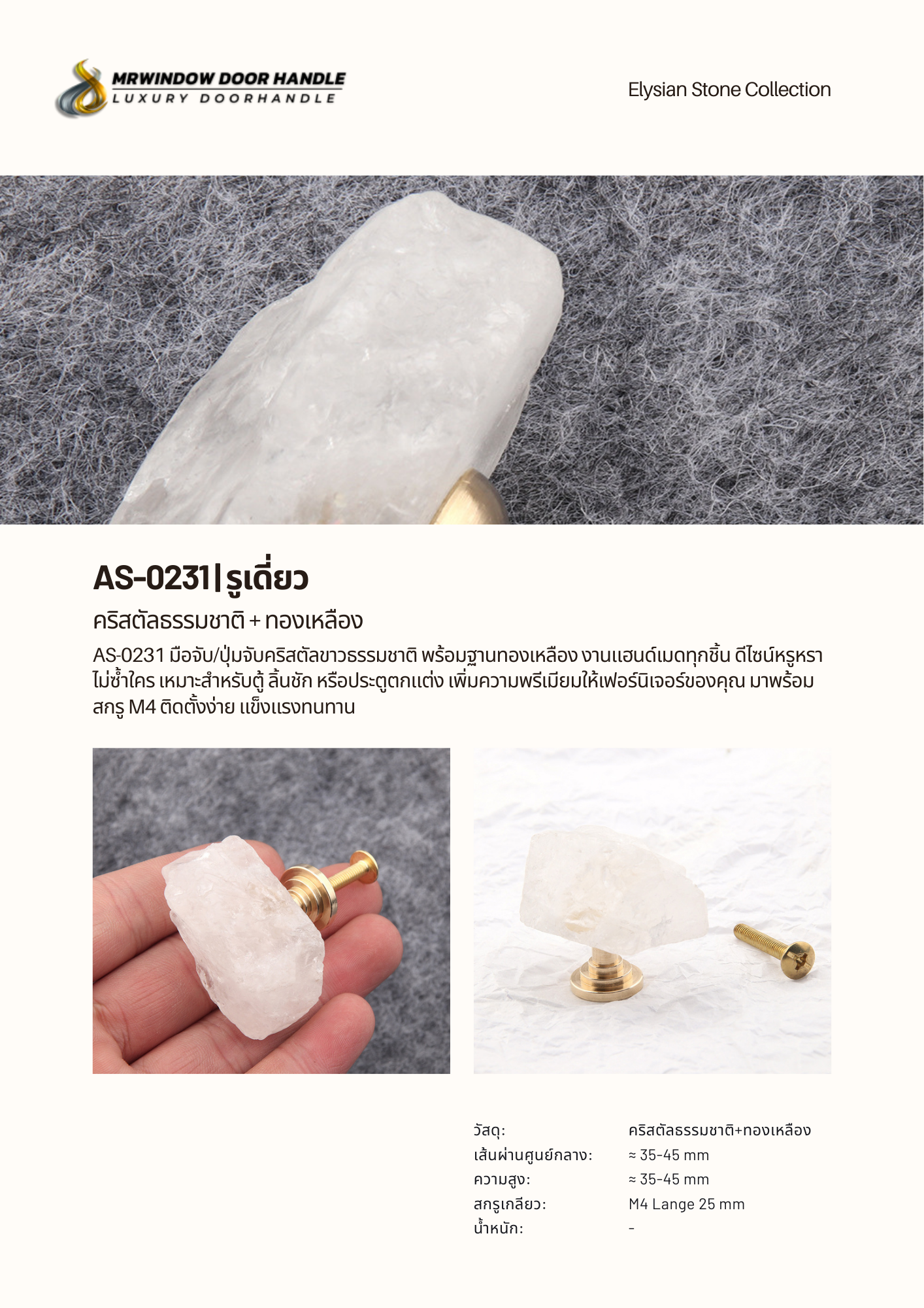 AS-0231 รูเดี่ยว คริสตัลธรรมชาติ + ทองเหลือง คือมือจับหรือปุ่มจับเฟอร์นิเจอร์ระดับลักชัวรี ที่ออกแบบมาเพื่อผู้ที่ให้ความสำคัญกับรายละเอียด ความเป็นเอกลักษณ์ และคุณค่าของวัสดุจากธรรมชาติอย่างแท้จริง ทุกชิ้นผลิตจากคริสตัลธรรมชาติแท้ ซึ่งมีลวดลาย รูปทรง และผิวสัมผัสเฉพาะตัว ไม่มีชิ้นใดเหมือนกัน ทำให้เฟอร์นิเจอร์ของคุณโดดเด่นและมีคาแรกเตอร์เฉพาะที่ไม่สามารถลอกเลียนแบบได้