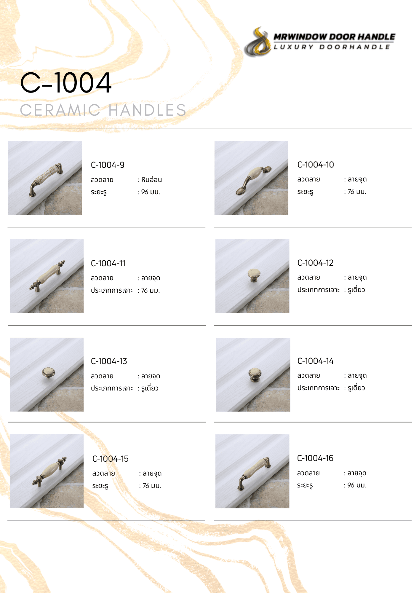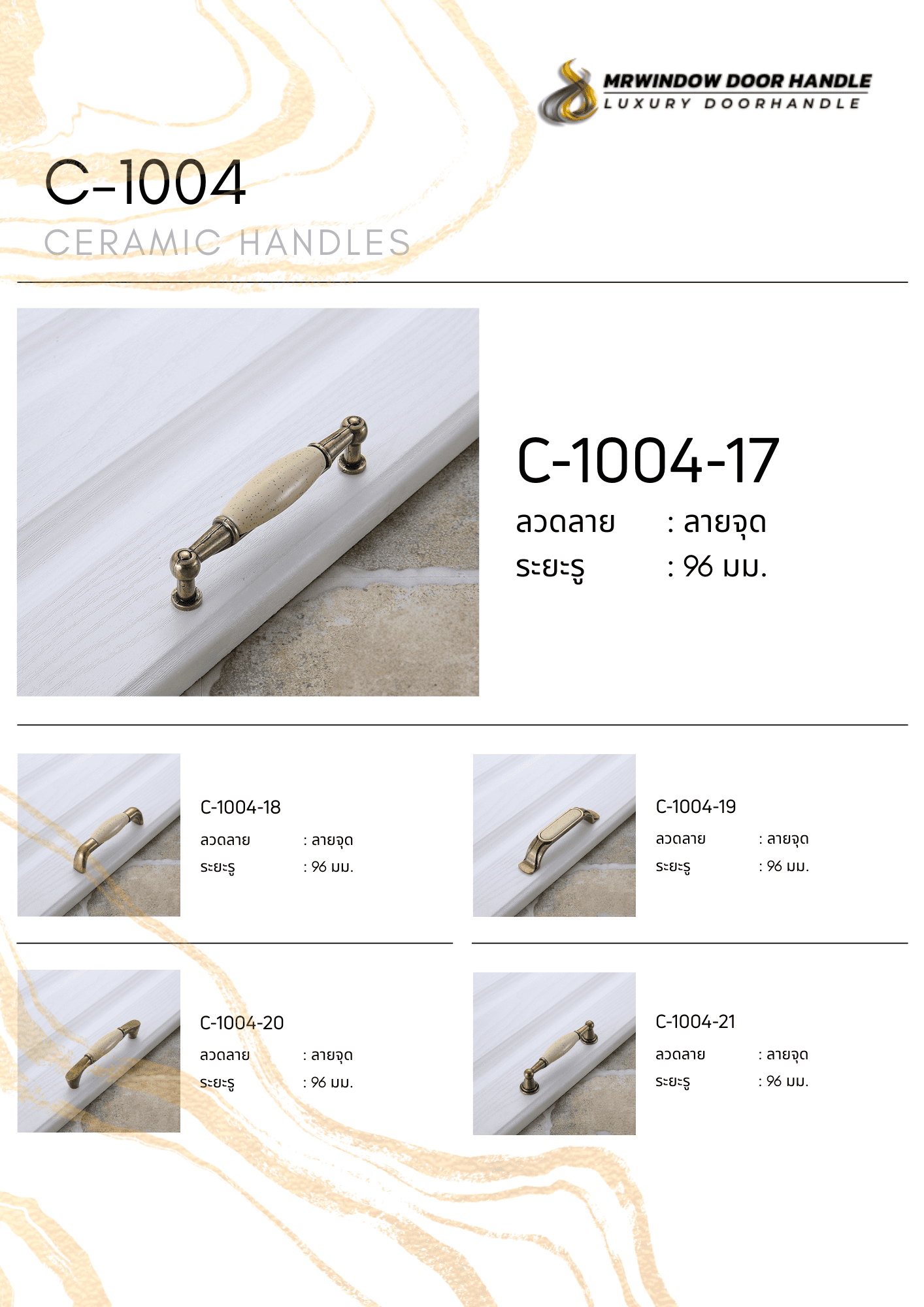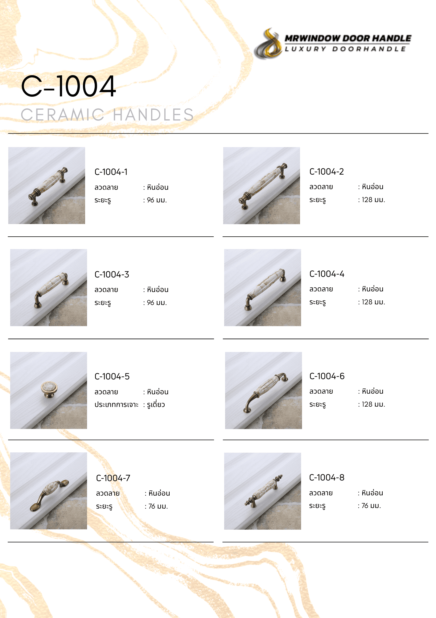 C-1004 Series คือคอลเลกชันมือจับเฟอร์นิเจอร์เซรามิกลายหินอ่อน ที่ออกแบบมาเพื่อตอบโจทย์งานตกแต่งสไตล์ Classic, European และ Luxury Built-in อย่างแท้จริง ตัวมือจับผสานวัสดุ Zinc Alloy แข็งแรง เข้ากับ Ceramic ลวดลายหินอ่อน ให้ความรู้สึกหรูหรา อบอุ่น และมีมิติ