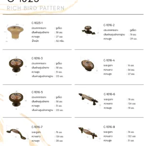 มือจับเฟอร์นิเจอร์ C-1023 Series (Rich Bird Pattern) คือผลงานที่ผสมผสานระหว่างงานศิลป์และฟังก์ชันการใช้งานอย่างลงตัว ลวดลาย “นกมงคล” และดอกไม้ถูกถ่ายทอดลงบนเซรามิกคุณภาพสูง ให้สีสันนุ่มลึก ดูมีชีวิตชีวาในแบบศิลปะคลาสสิกยุโรป สื่อถึงความอุดมสมบูรณ์ ความสง่างาม และความโชคดี