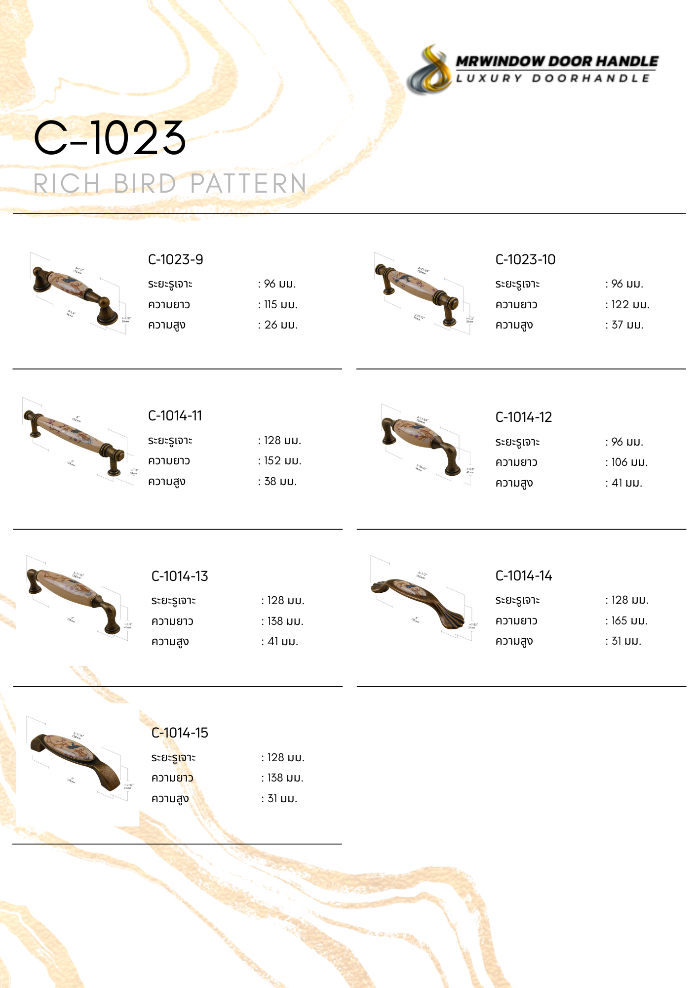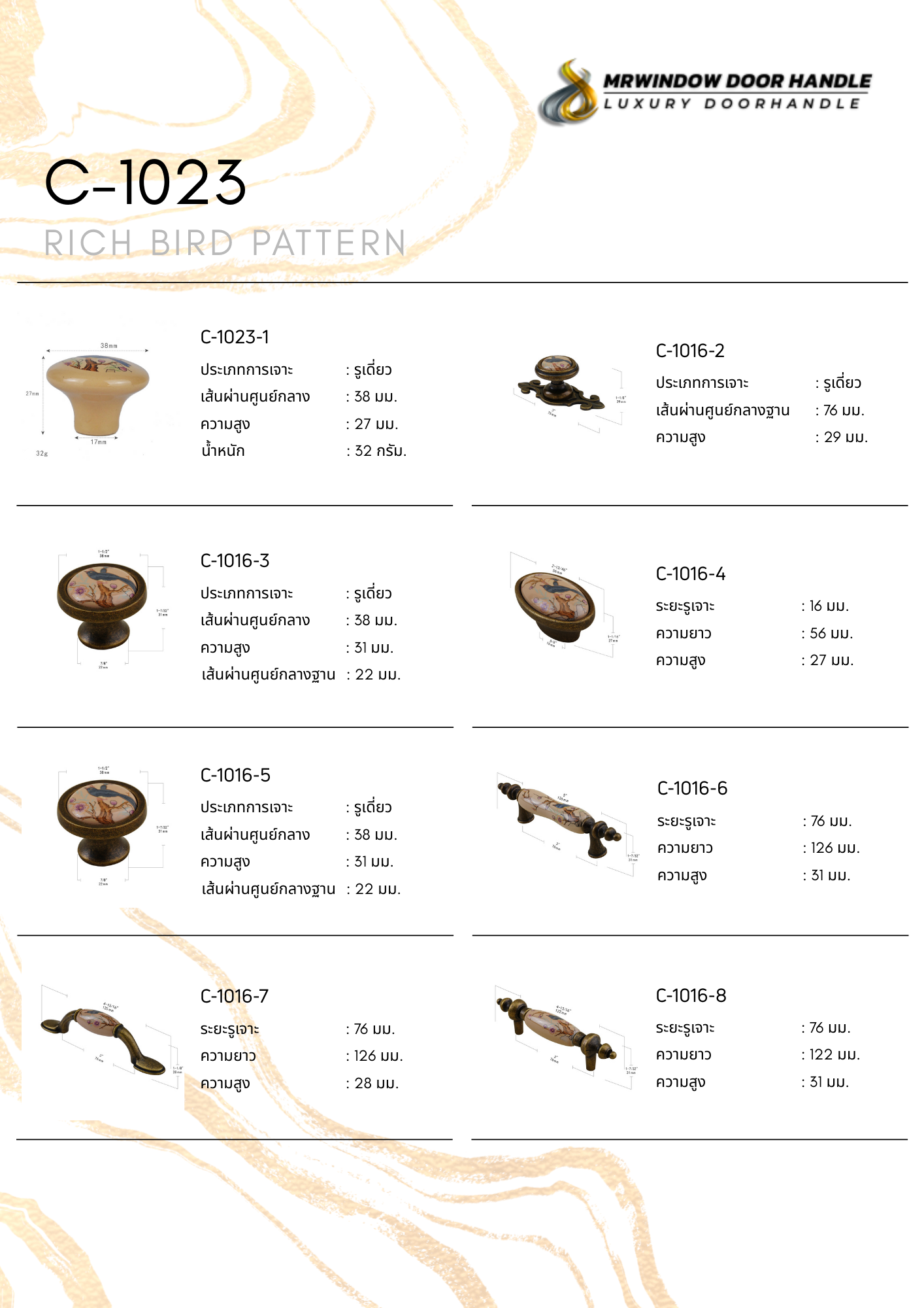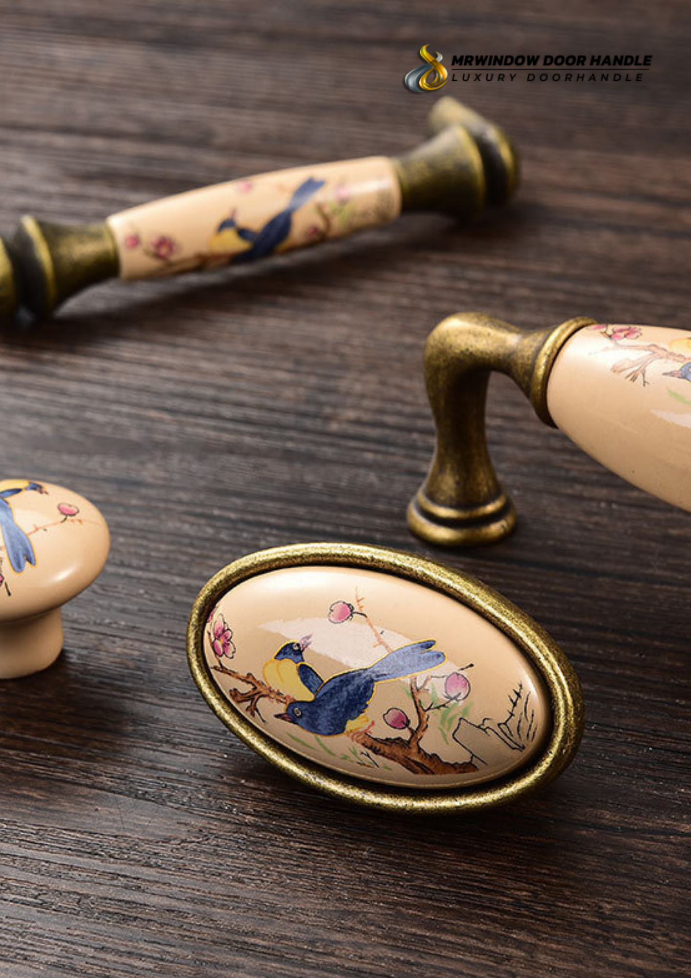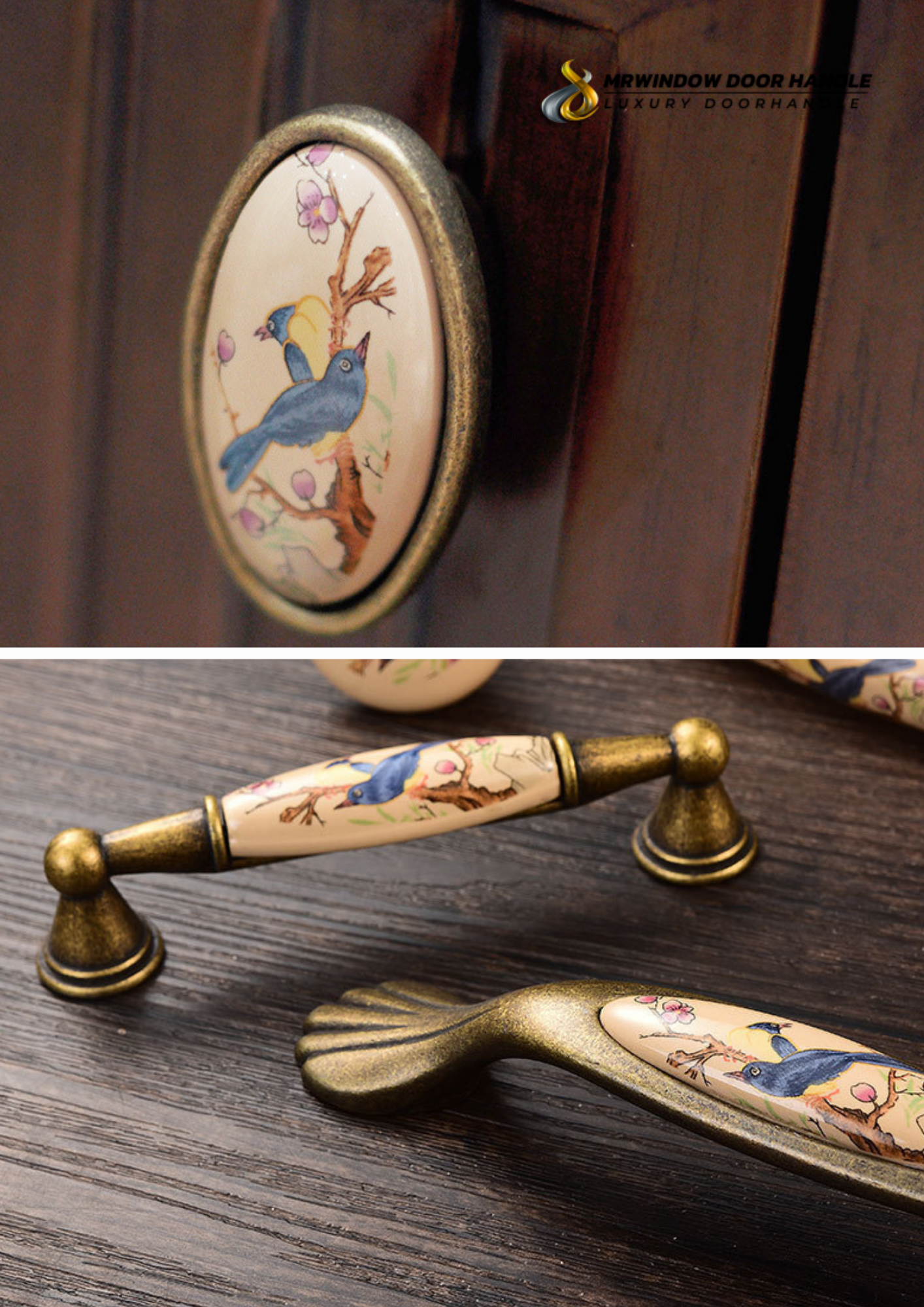 มือจับเฟอร์นิเจอร์ C-1023 Series (Rich Bird Pattern) คือผลงานที่ผสมผสานระหว่างงานศิลป์และฟังก์ชันการใช้งานอย่างลงตัว ลวดลาย “นกมงคล” และดอกไม้ถูกถ่ายทอดลงบนเซรามิกคุณภาพสูง ให้สีสันนุ่มลึก ดูมีชีวิตชีวาในแบบศิลปะคลาสสิกยุโรป สื่อถึงความอุดมสมบูรณ์ ความสง่างาม และความโชคดี