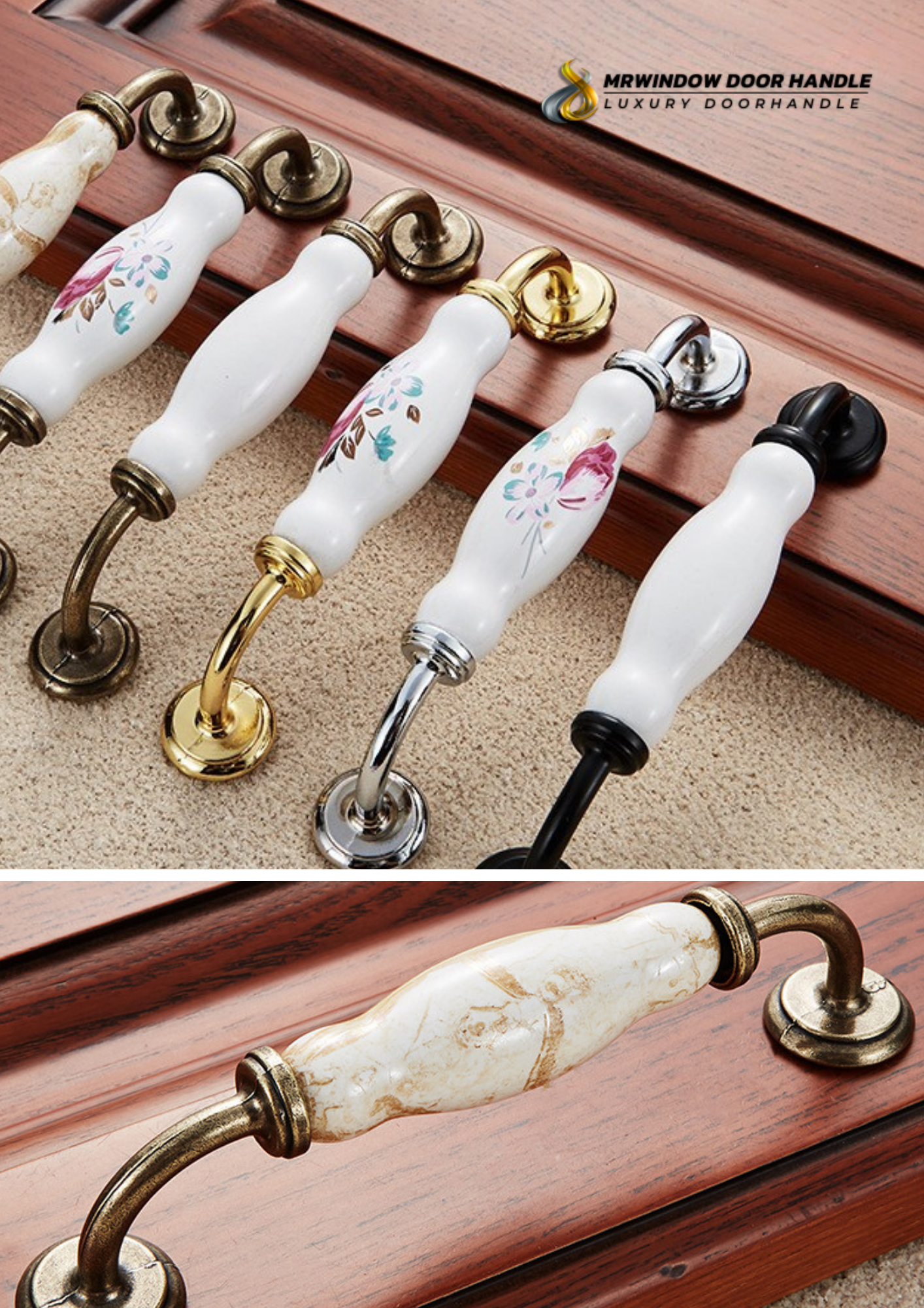 ตัวแกนผลิตจาก เซรามิกเนื้อแน่น เคลือบผิวเรียบเงา ลวดลายหินอ่อนและลายดอกไม้ให้ความรู้สึกอบอุ่น หรูหรา และมีเอกลักษณ์เฉพาะตัว ส่วนฐานจับทำจากโลหะคุณภาพสูง เคลือบผิวหลากหลายโทนสี เช่น Antique Brass, Gold, Chrome และ Black เพิ่มความแข็งแรงและความทนทานในการใช้งานระยะยาว