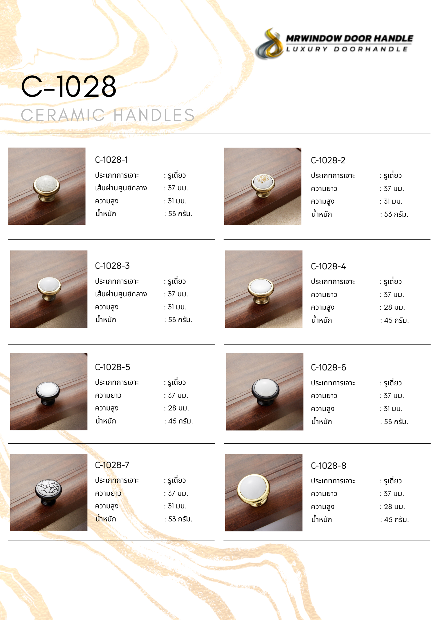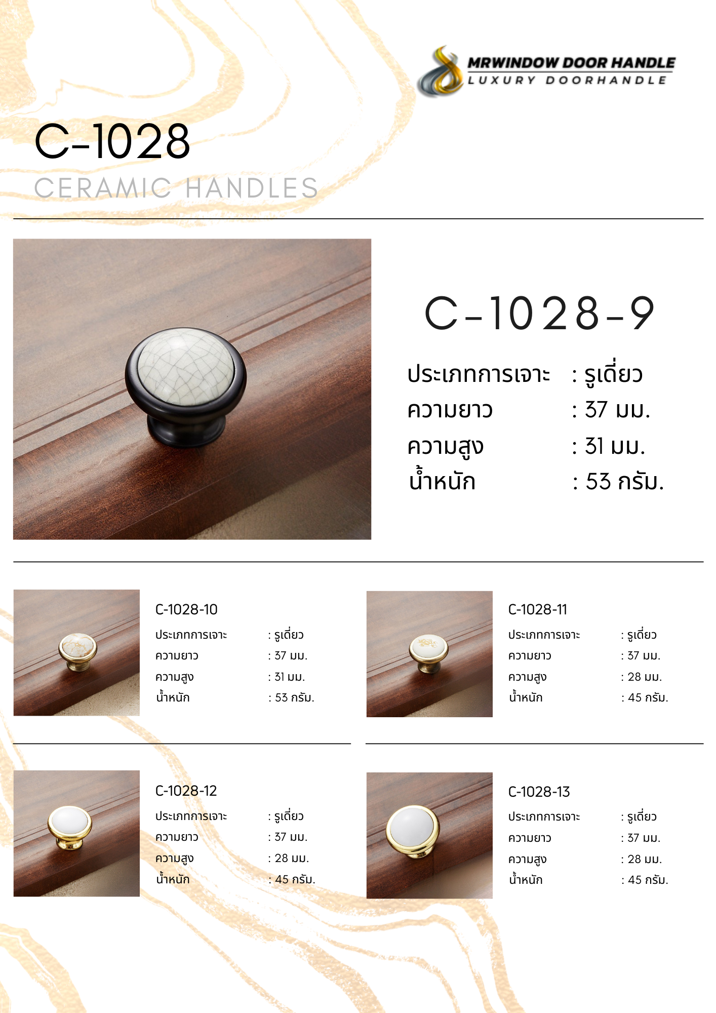 C-1028 Series คือคอลเลกชันมือจับและลูกบิดเซรามิกระดับพรีเมียม ที่ถูกสร้างสรรค์ขึ้นเพื่อสะท้อนรสนิยมอันประณีตและความหรูหราที่ไม่ขึ้นกับกาลเวลา ด้วยการผสมผสานระหว่างศิลปะงานเซรามิกคุณภาพสูง และโครงสร้างโลหะที่แข็งแรง ทนทาน และให้ความรู้สึกมั่นคงทุกครั้งที่สัมผัส