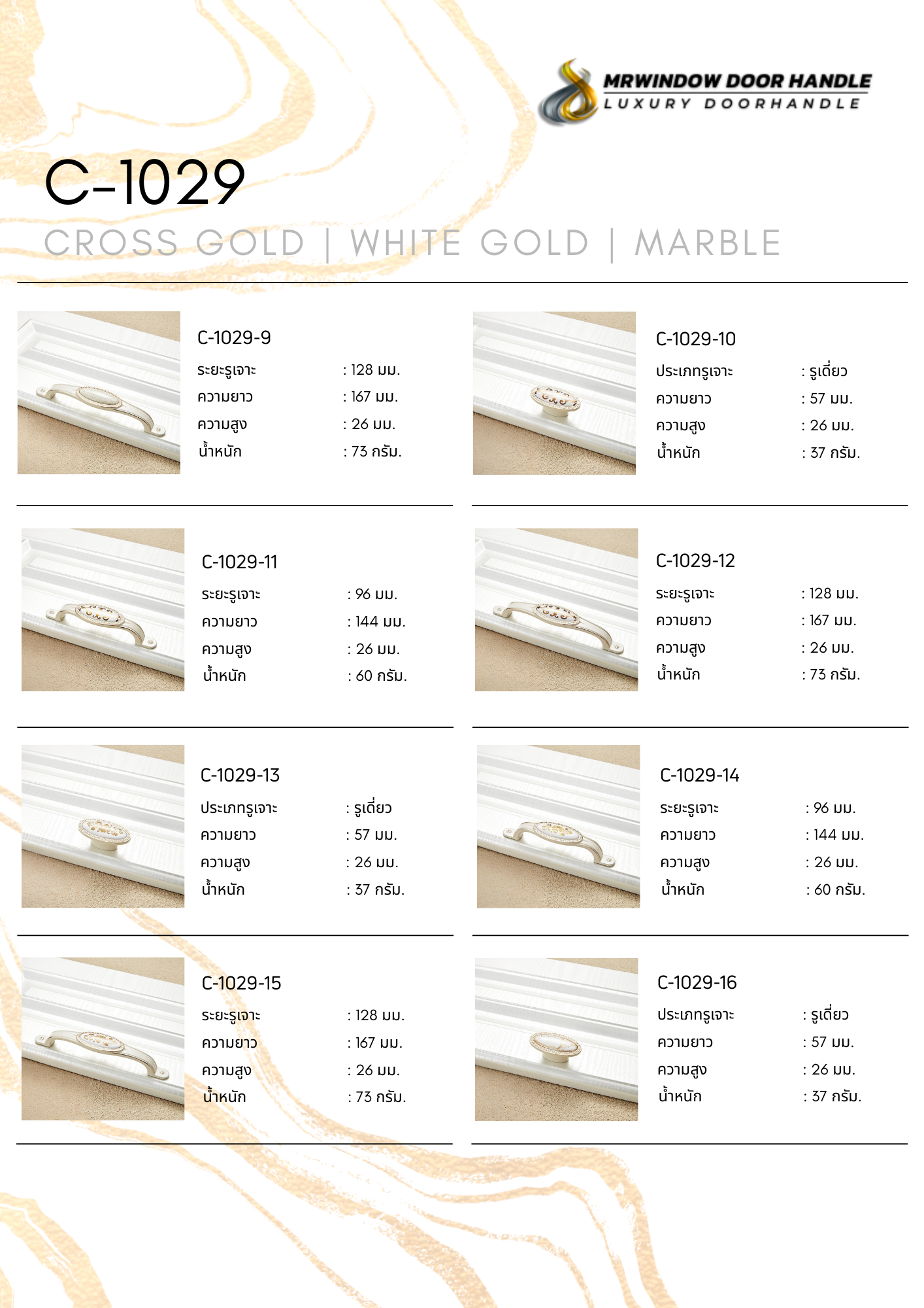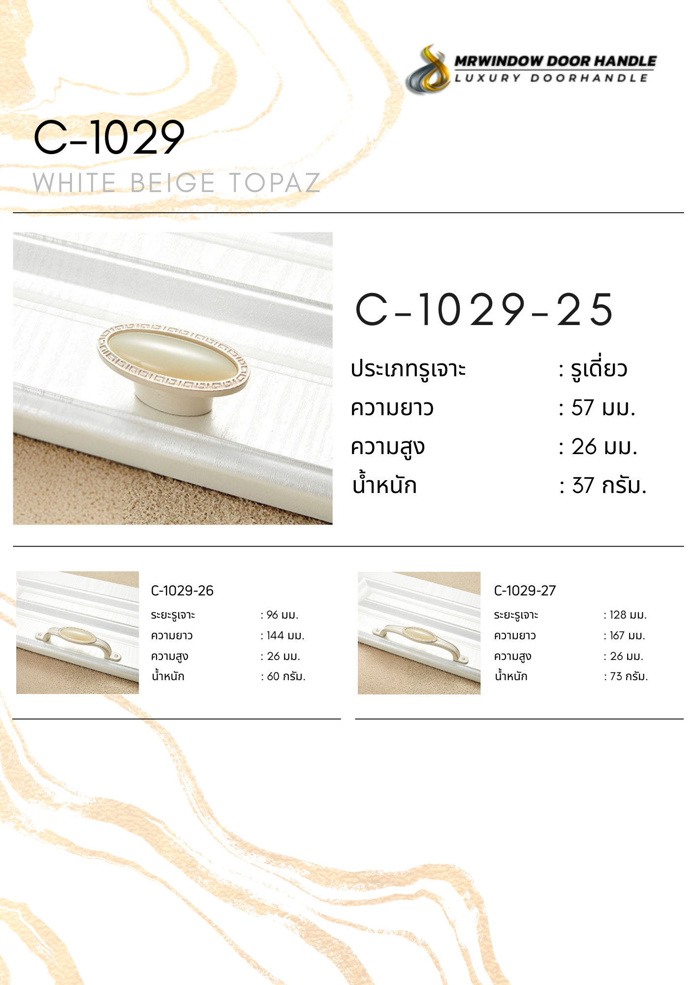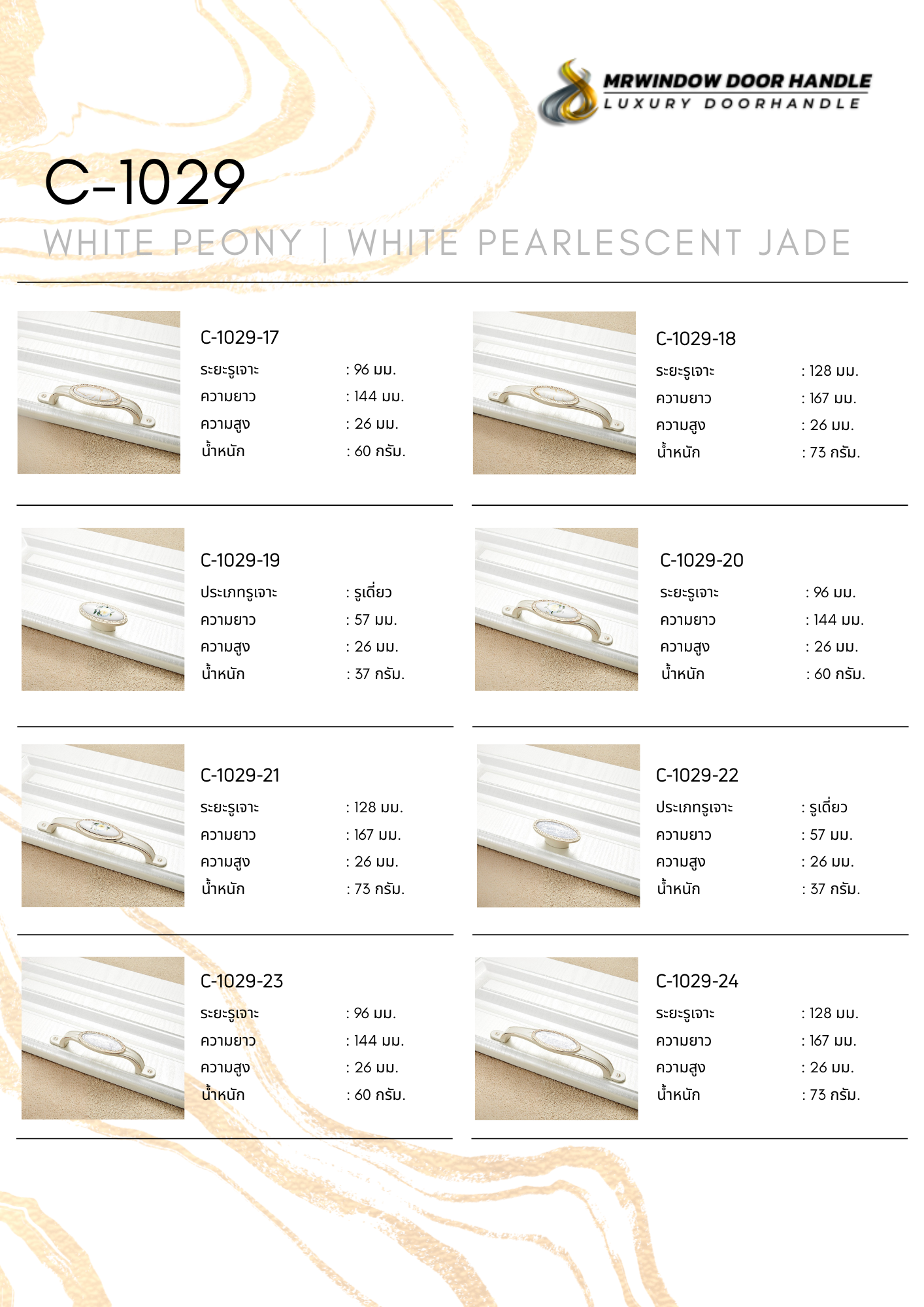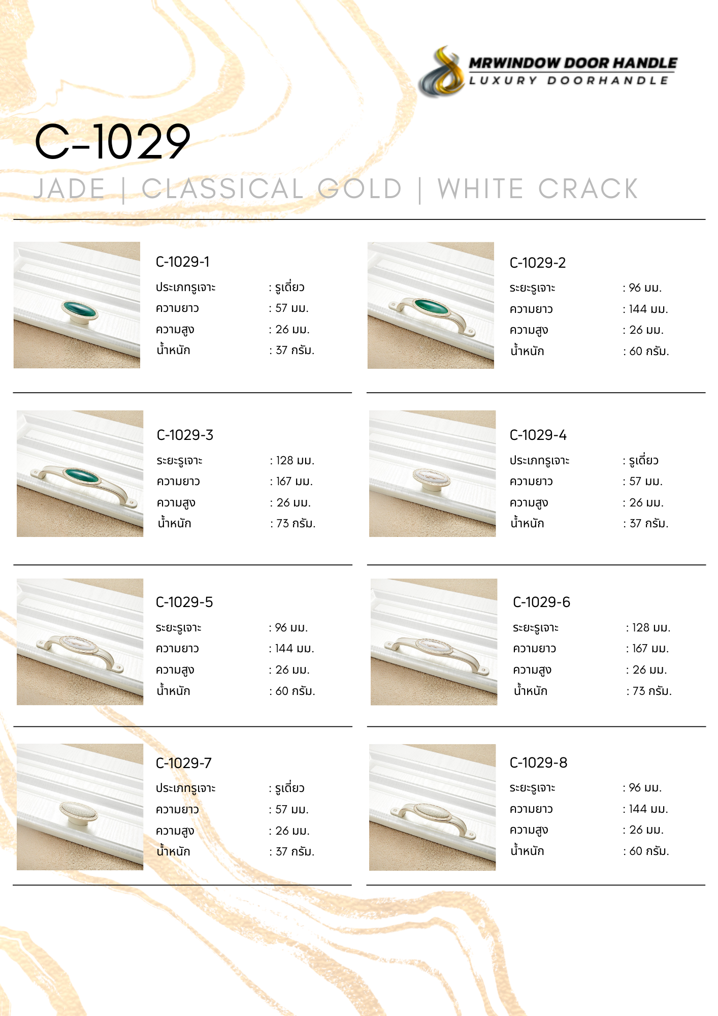 มือจับเซรามิก C-1029 Series คือคอลเลกชันที่ออกแบบมาเพื่อเติมเต็มงานตกแต่งภายในระดับพรีเมียม ด้วยแรงบันดาลใจจากศิลปะคลาสสิกยุโรป ผสานความอ่อนละมุนของโทนสีขาวและทองเข้ากับลวดลายเซรามิกที่มีเอกลักษณ์เฉพาะตัว ไม่ว่าจะเป็นลายหินอ่อน ลายหยก หรือพื้นผิว White Crack ที่ให้ความรู้สึกหรูหราอย่างเป็นธรรมชาติ
