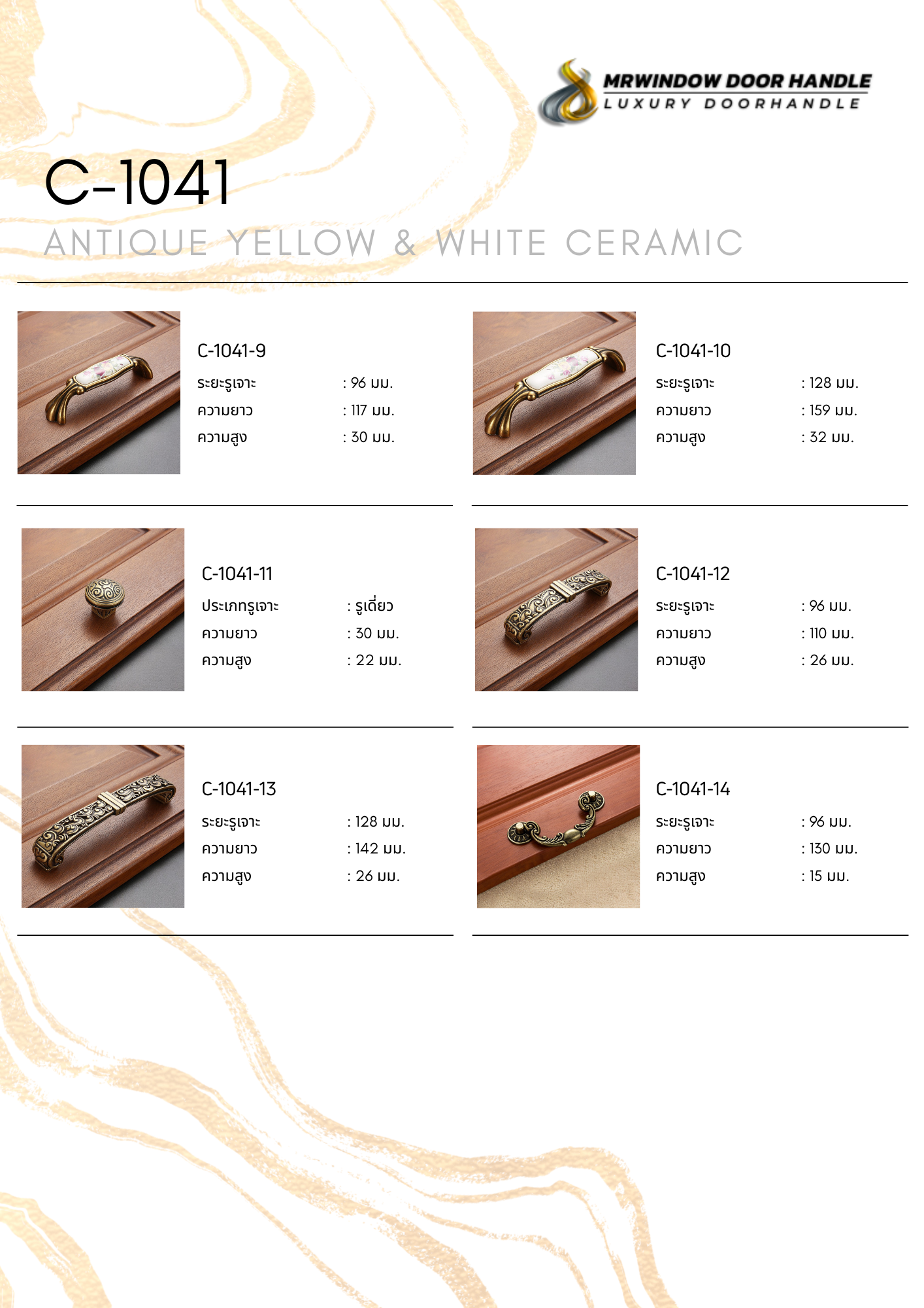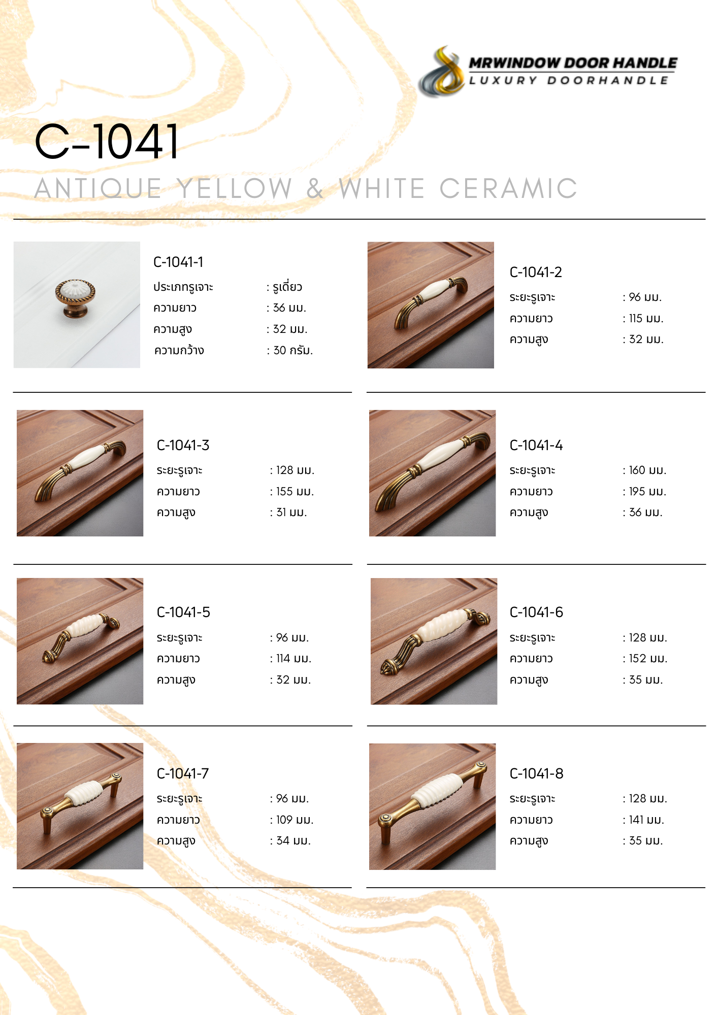 C-1041 Series – Antique Yellow & White Ceramic คือคอลเลกชันมือจับเฟอร์นิเจอร์ระดับพรีเมียม ที่ออกแบบมาเพื่อตอบโจทย์งานตกแต่งภายในสไตล์ Classic, Vintage, European Luxury และ Luxury Traditional โดยเฉพาะ ทุกชิ้นสะท้อนงานดีไซน์ที่พิถีพิถัน ตั้งแต่การเลือกวัสดุ ไปจนถึงการเก็บรายละเอียดของพื้นผิวและสัดส่วน