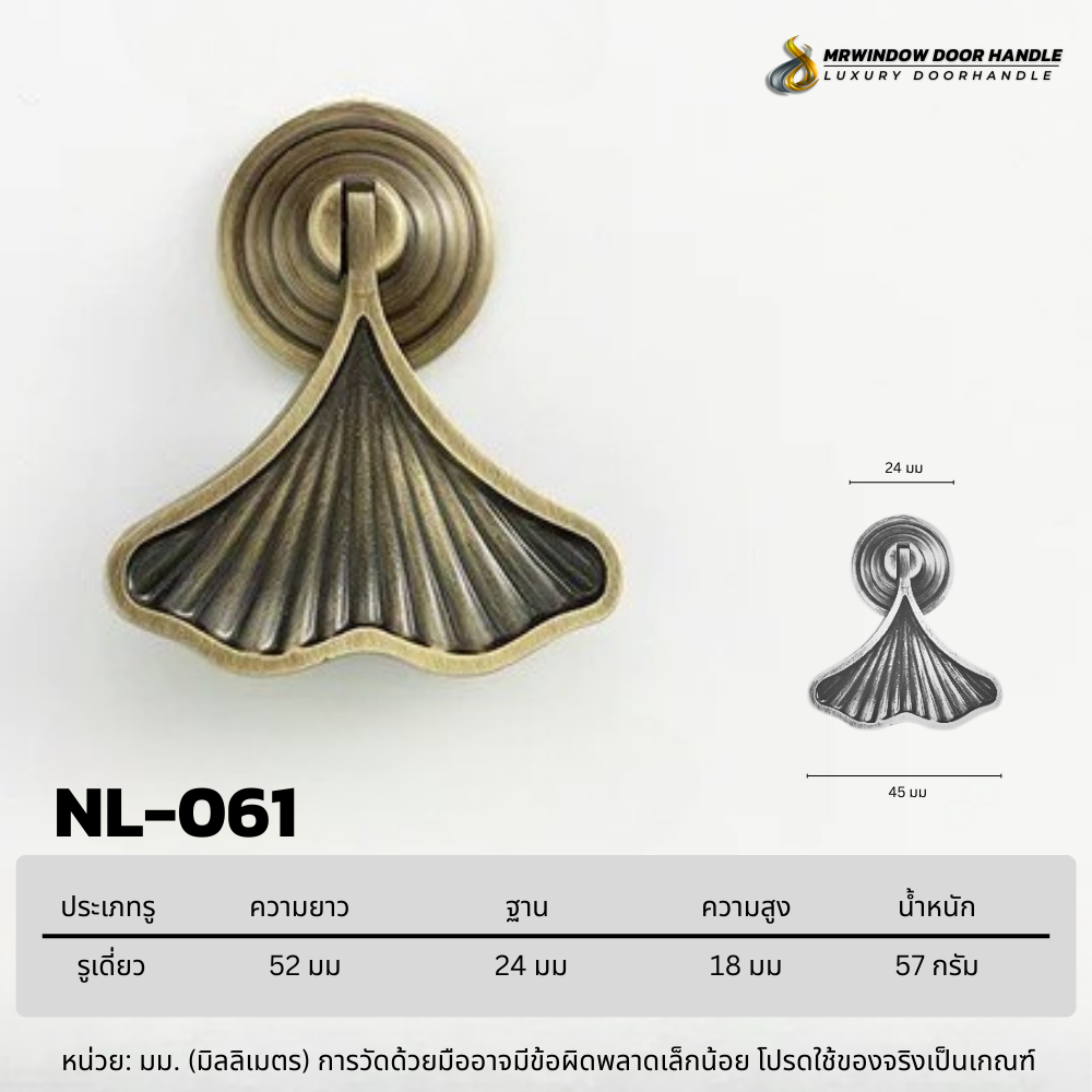 NL-061 ปุ่มจับทองเหลืองโบราณ ที่ออกแบบมาเพื่อสร้าง “จุดเด่น” ให้กับเฟอร์นิเจอร์โดยเฉพาะ ด้วยดีไซน์ แบบแขวน (Drop Style) รูปทรงลายพัดที่มีเส้นสายโค้งอ่อนช้อย ให้ความรู้สึกหรู คลาสสิก และมีมิติ แตกต่างจากปุ่มจับทั่วไปอย่างชัดเจน