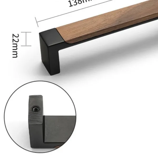 ตัวมือจับผลิตจากไม้แท้คุณภาพสูง ผสานกับขาโลหะสังกะสีหล่อ (Zinc Alloy) แข็งแรง ทนทานต่อการใช้งานระยะยาว พร้อมพื้นผิวสีดำด้านและสีทองบรัช ช่วยเพิ่มมิติและความหรูหราให้กับตู้หรือหน้าบานได้อย่างลงตัว