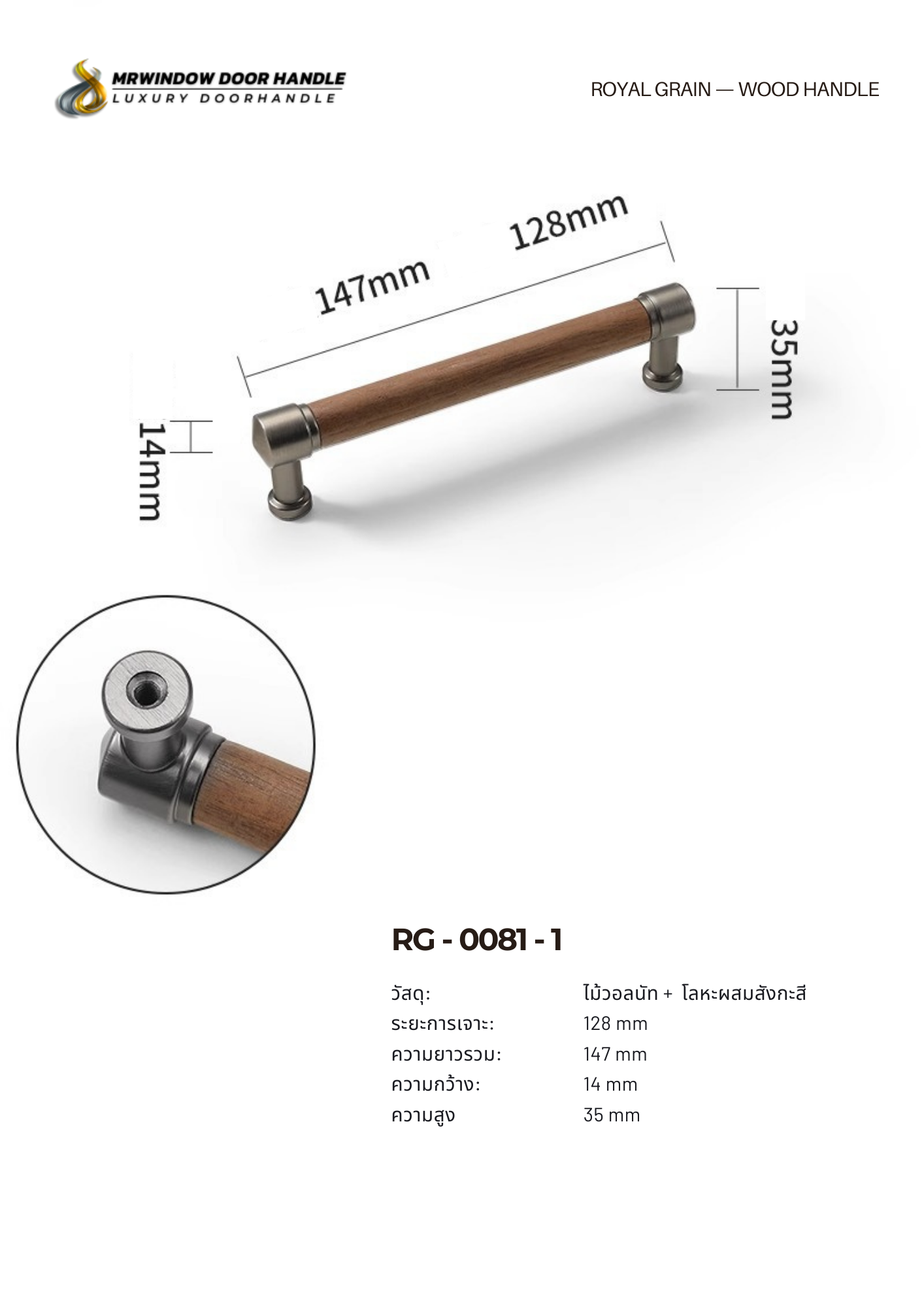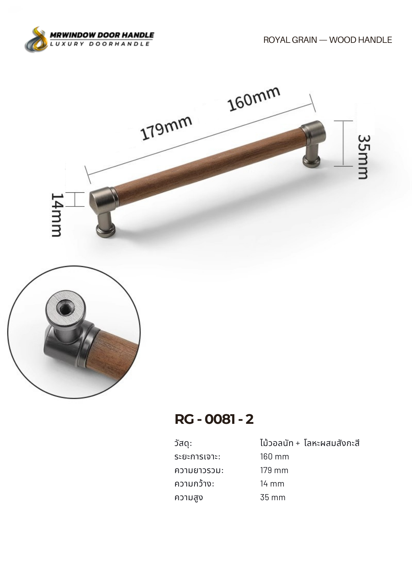 จุดเด่นของรุ่นนี้คือ ก้านทรงกลมไม้จริง จับถนัดมือ ลื่นไหลในการใช้งาน เปิด–ปิดสบาย ไม่บาดมือ และช่วยให้หน้าบานดูโปร่งขึ้น ขาและหัวจับเป็น โลหะผสมสังกะสี ที่ให้ความแข็งแรง รองรับการใช้งานระยะยาว โครงสร้างแน่น ลดโอกาสหลวมคลอน เหมาะกับทั้งงานบ้านและงานโครงการ