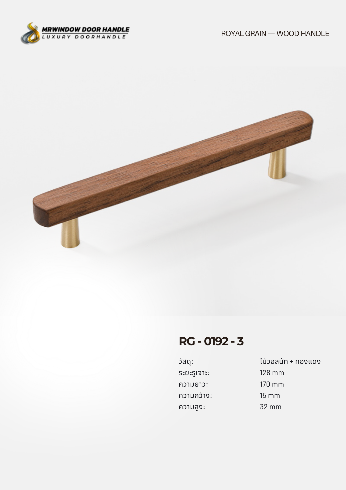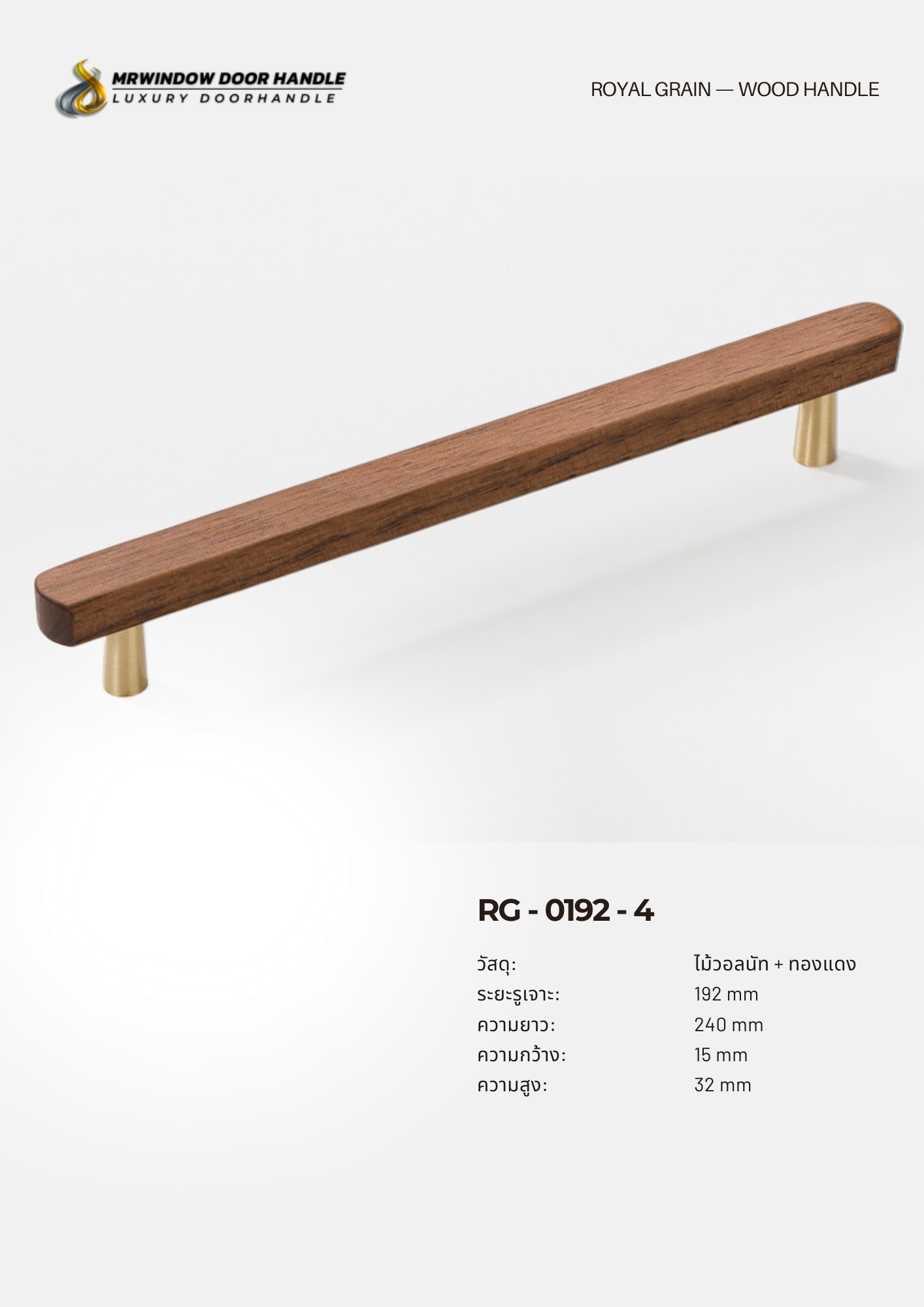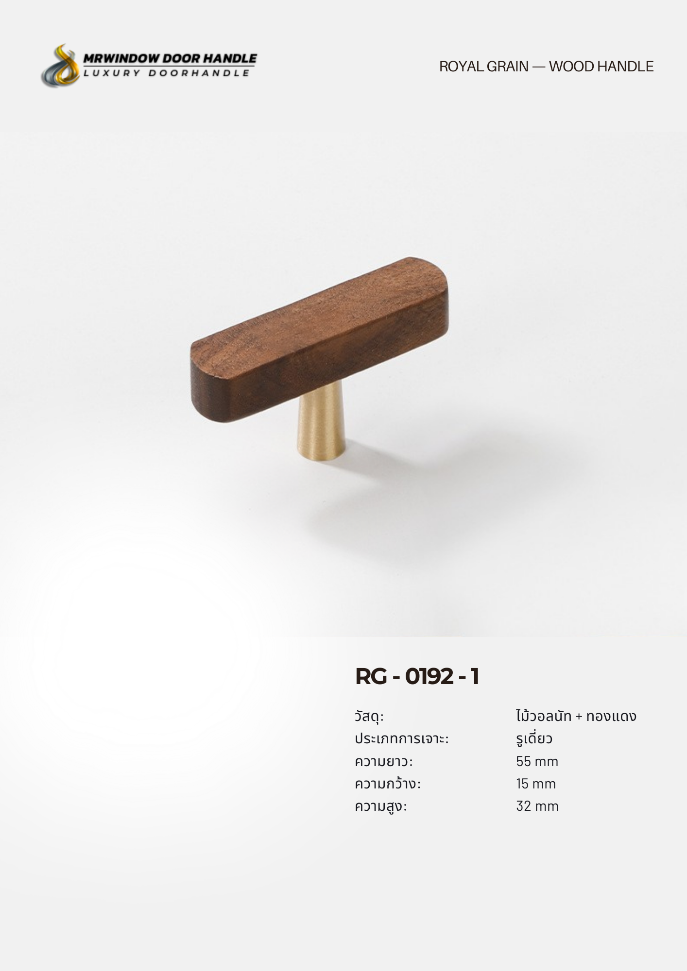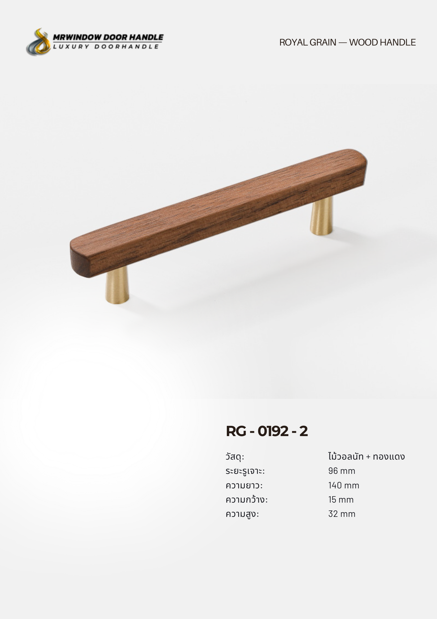 RG-0192 คือชุดมือจับไม้แท้ผสมฐานทองแดง (Brass Finish) ที่ออกแบบมาในสไตล์ Modern Luxury ผสมผสานความอบอุ่นของไม้วอลนัทเข้ากับความหรูของโลหะสีทองแดงได้อย่างลงตัว