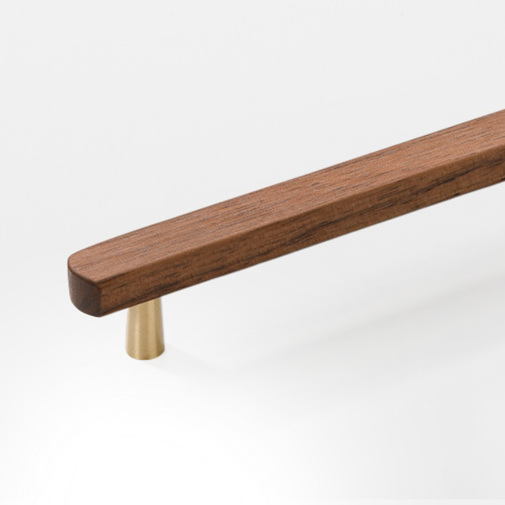 ตัวด้ามจับผลิตจากไม้วอลนัทแท้ ลายไม้ธรรมชาติสวยงาม ให้โทนสีน้ำตาลเข้มดูพรีเมียม ส่วนฐานขาทำจากทองแดงโทนทอง เพิ่มความหรูและมิติให้หน้าบานเฟอร์นิเจอร์