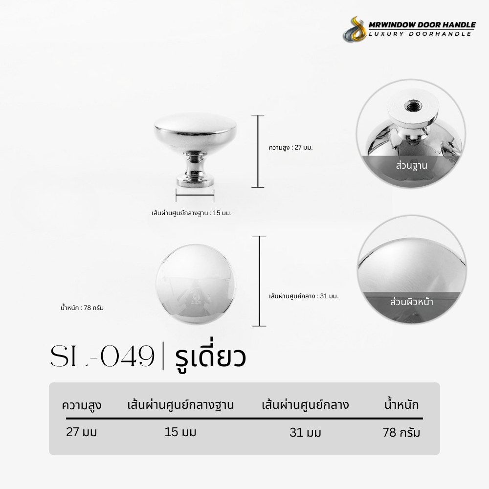ปุ่มจับรุ่น SL-048 และ SL-049 คือปุ่มจับเฟอร์นิเจอร์ทรงกลมสไตล์เรียบหรู ที่ออกแบบให้เข้ากับงานตกแต่งได้กว้างมาก ตั้งแต่ Modern, Minimal, Contemporary ไปจนถึง Luxury Classic จุดเด่นคือผิว Silver เงา ที่ให้ความรู้สึกสะอาด เนี้ยบ และดูแพง เหมาะกับงานบิวท์อินที่ต้องการรายละเอียดเล็ก ๆ แต่ยกระดับภาพรวมของงานได้ชัด