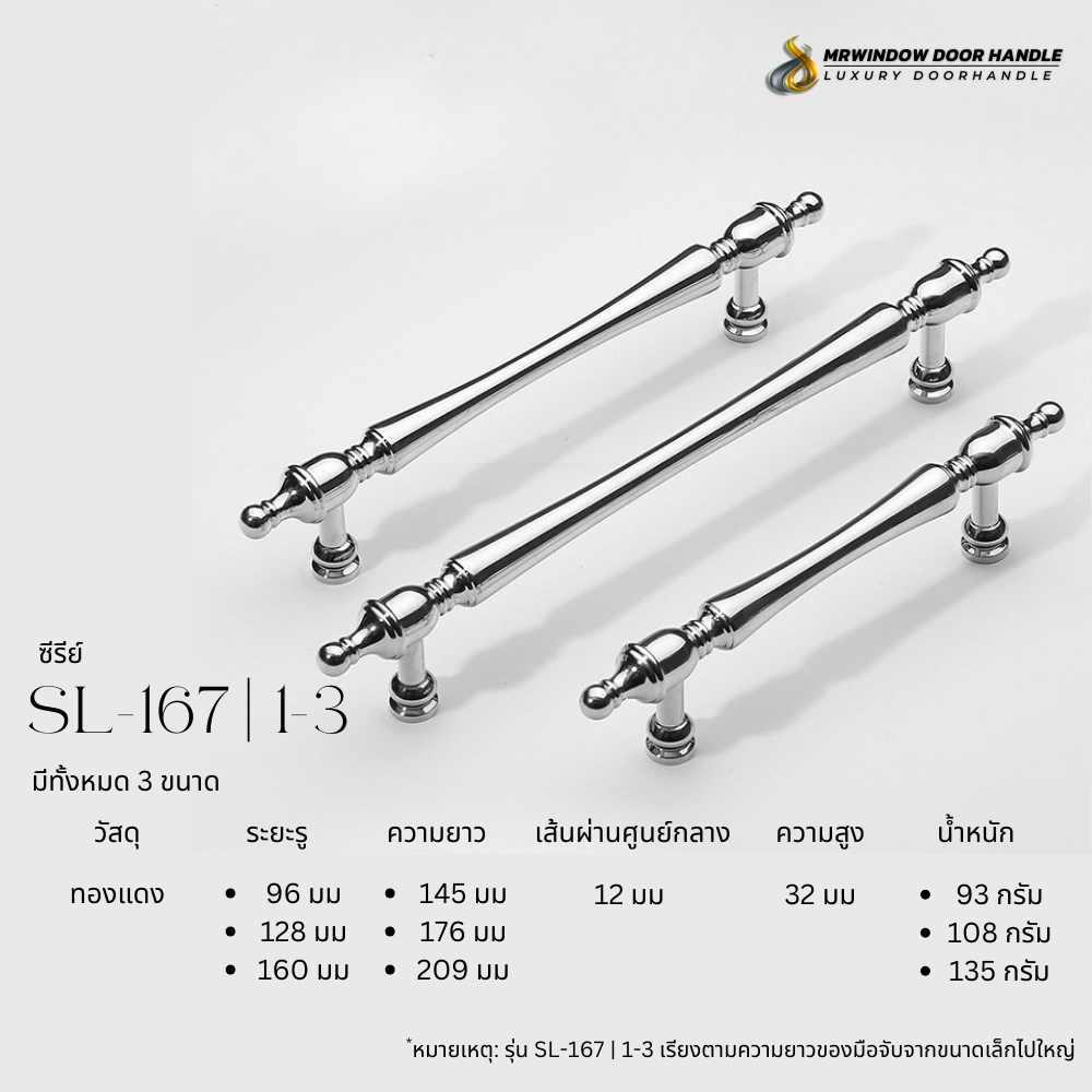 จุดเด่นของรุ่น SL-167 คือ สัดส่วนที่สมดุล ไม่ว่าจะใช้กับลิ้นชักขนาดเล็กหรือหน้าบานตู้ขนาดใหญ่ มือจับยังคงดูสวยและไม่แย่งสายตาจากดีไซน์หลักของเฟอร์นิเจอร์ จึงเหมาะมากกับงานบิลท์อิน บ้านพักอาศัย คอนโด โรงแรม หรือโครงการที่ต้องการภาพรวมดูหรูอย่างสม่ำเสมอ